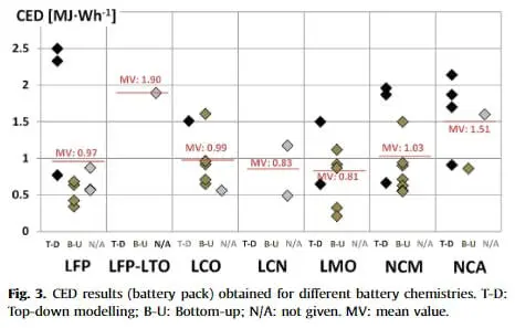 There is a large variance depending not only on the type of battery considered, but also the study methodology. 1.182 MJ/Wh is the average over all studies, but is not to be taken as an absolute. Energy demand is calculated either by dividing the total energy demand of a production facility among its battery operations (so-called ‘top-down’ method), or by following the batteries through a factory without considering the rest of the production (so-called ‘bottom-up’ method). The former produces higher estimates than the latter.
